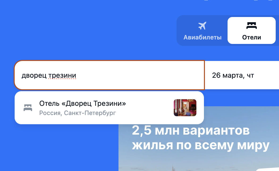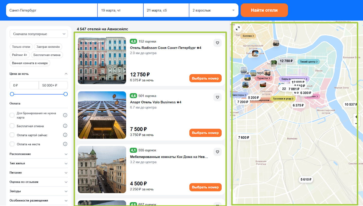 Пример: введите в поиске Санкт-Петербург → Авиасейлс выдаст все отели города → найдите отель по списку слева или по карте справа