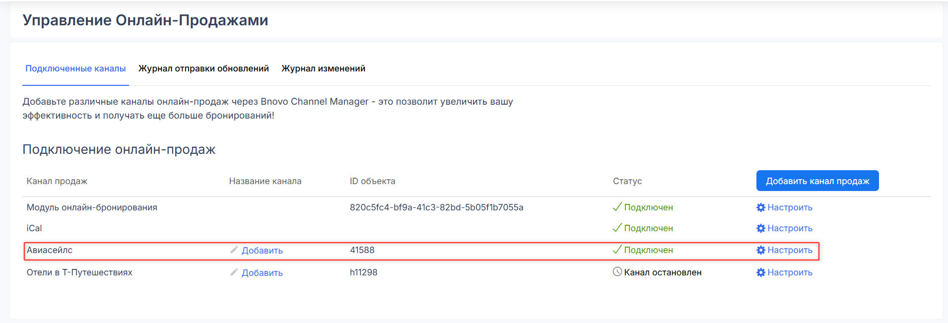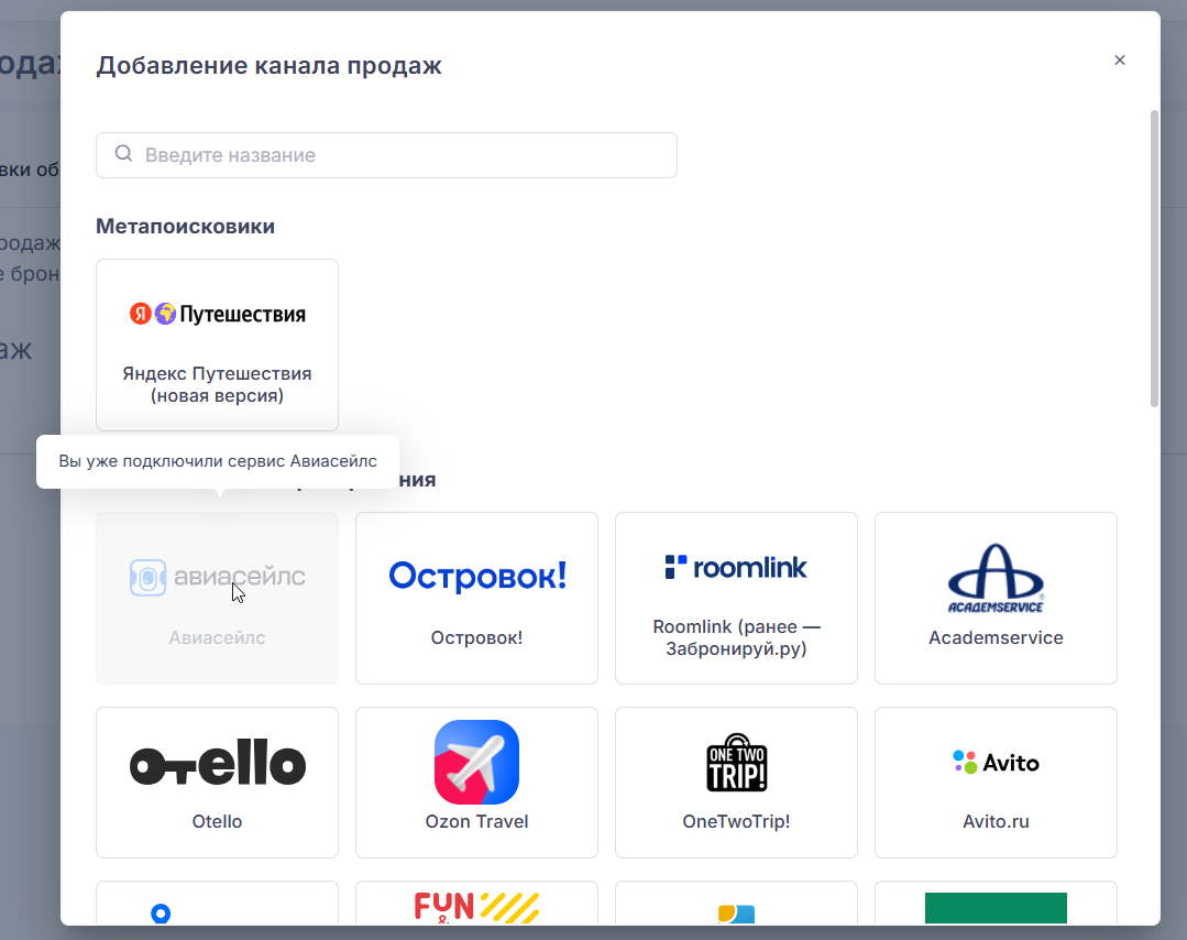 • подключение к Авиасейлс отобразится в списке подключённых каналов;