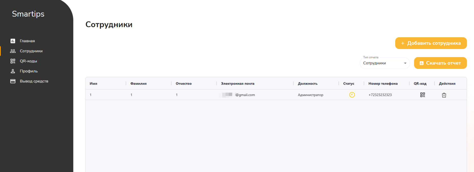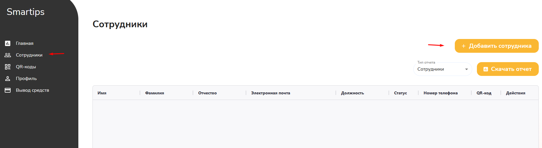 - Во вкладке «Сотрудники» нажмите на кнопку «+ Добавить сотрудника».