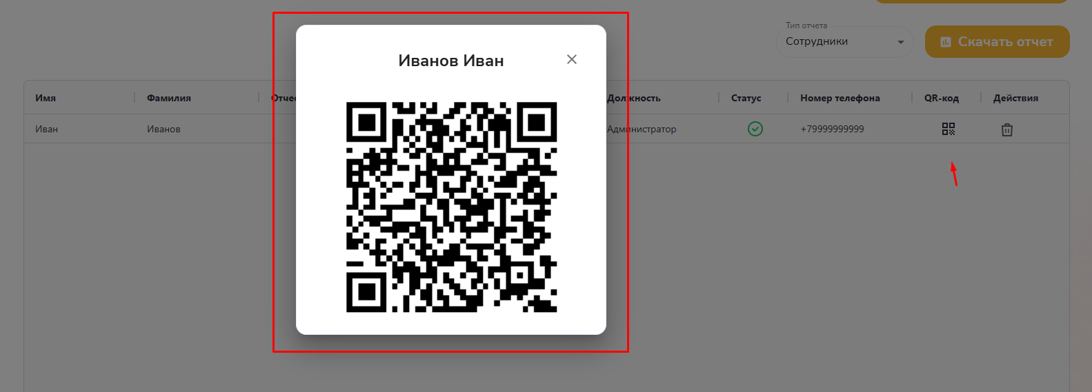 Для каждого сотрудника автоматически создается персональный QR-код, который можно показать гостям в отеле.