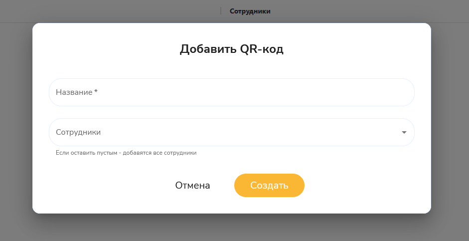 Название QR-кода — обязательное поле. - Выбрать, кому он будет принадлежать — одному сотруднику или всей команде. Если никого не выбрать, чаевые по этому коду пойдут общими на всех.