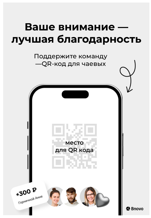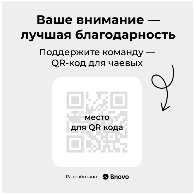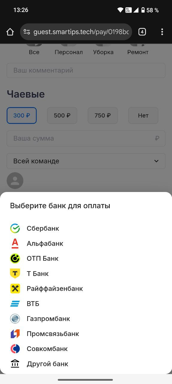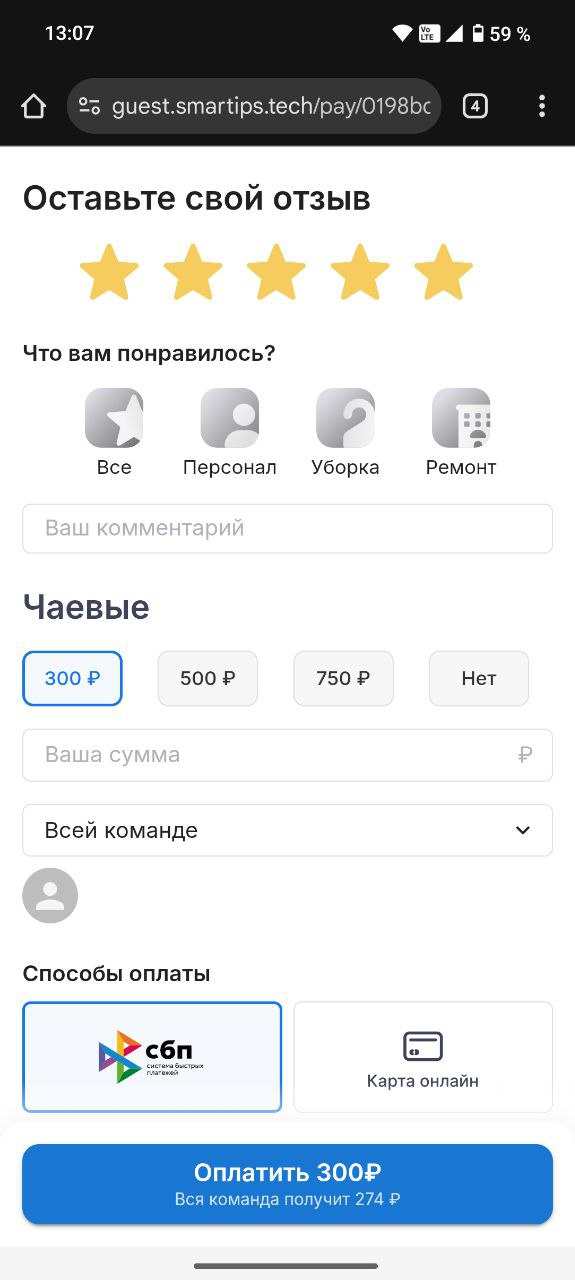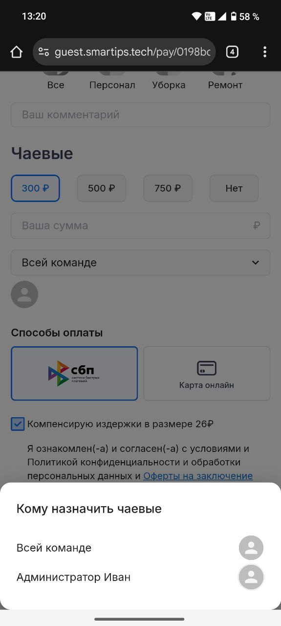 - Если гость выбрал сумму, чаевые можно отправить всей команде или конкретному сотруднику.