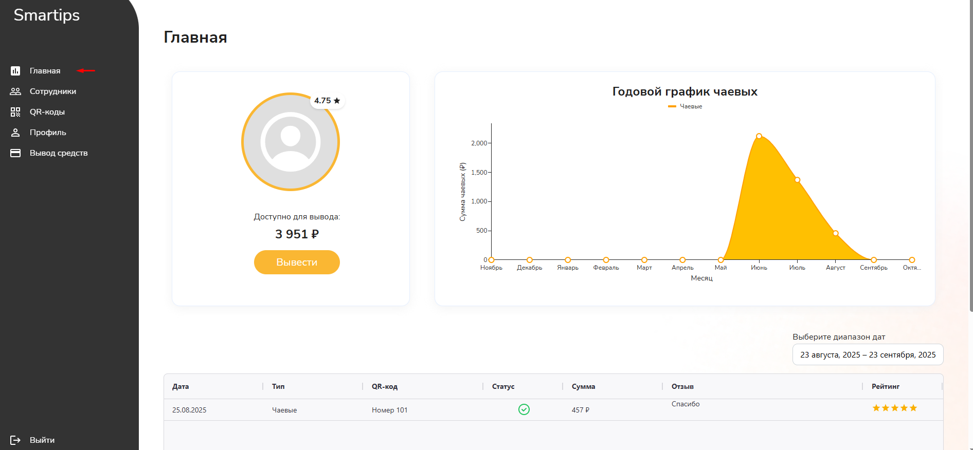 Всю историю чаевых, отзывов и вывода средств легко отслеживать с помощью фильтра по датам.