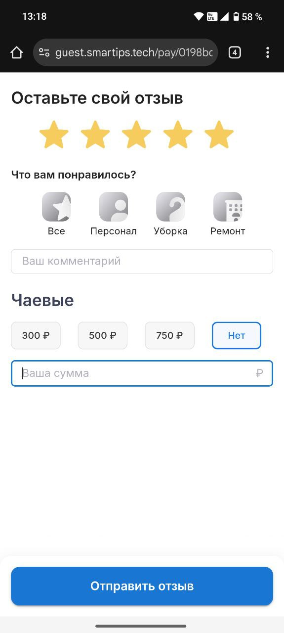 - Если гость хочет оставить только отзыв без чаевых, нажимает кнопку «Нет». После этого, вместо кнопки «Оплатить» — появится «Отправить отзыв». Останется только отправить отзыв.