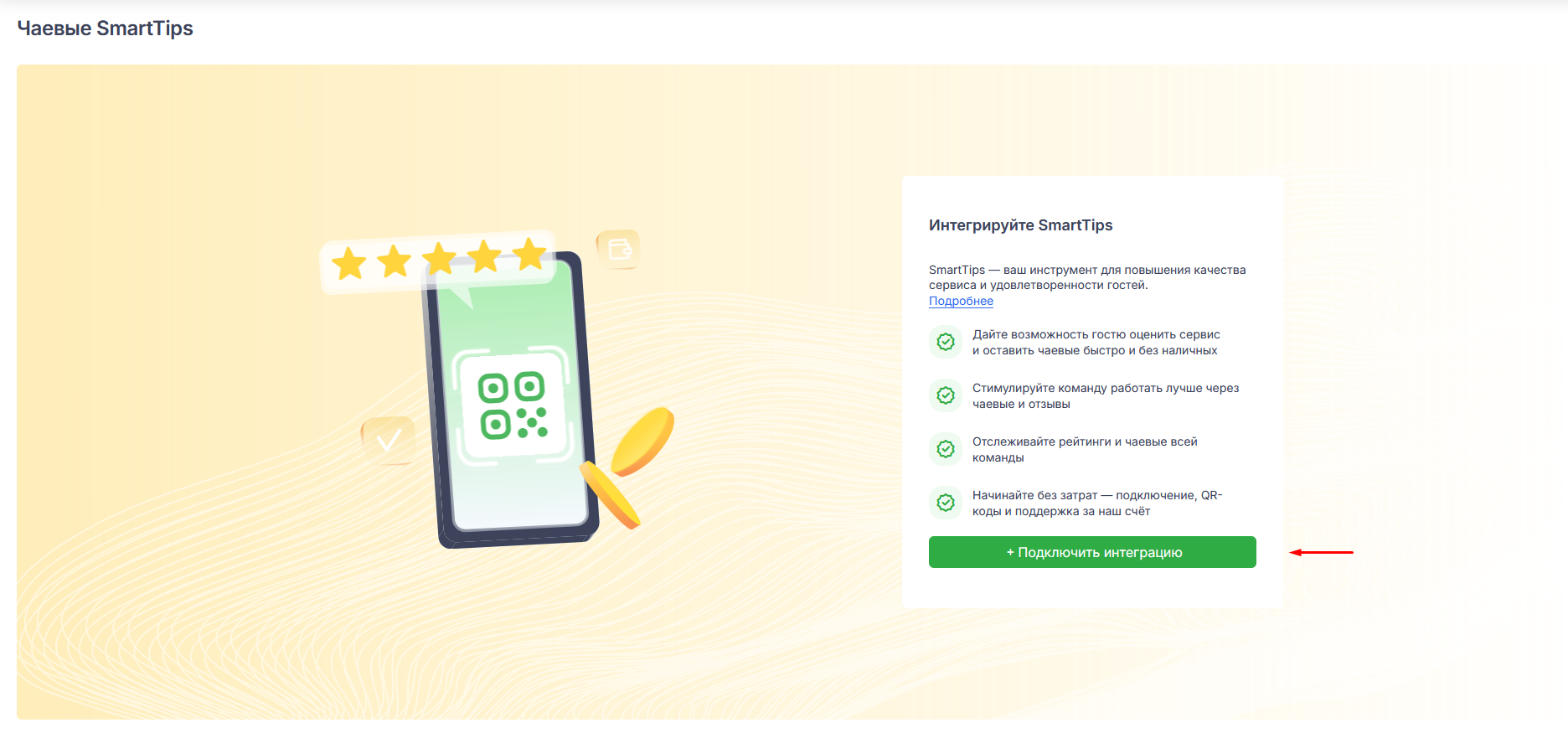 - Найти интеграцию «Чаевые и отзывы» и нажать кнопку «Подключить».