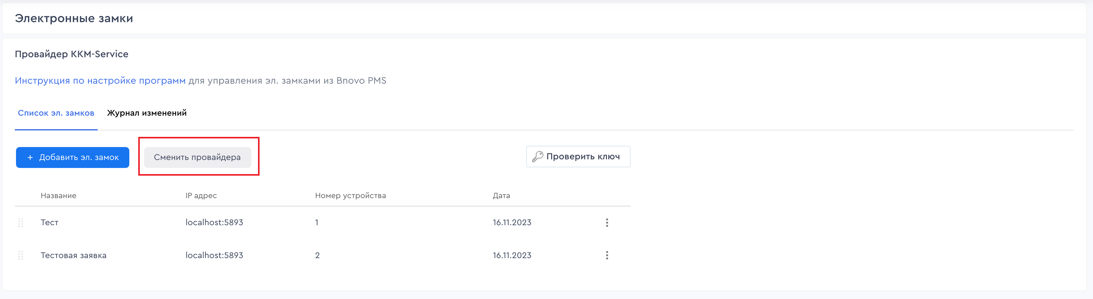 7. По кнопке Настройки связи с замковой системой укажите параметры, специфические для выбранной замковой системы. Например, настройки для Salto: 8. Далее на вкладке Web-сервер укажите порт (по умолчанию 5893), который будет использовать (прослушивать) сервер для приёма web-запросов от пользователей (Bnovo), а также заполните поля Логин, Пароль и Код активации и создайте серверный сертификат (нажатием на кнопку Создать серверный сертификат): 9. Запустите службу замкового сервера: 10. Перейдите в Bnovo → раздел Меню ☰ → Электронные замки → Добавить эл. замок: 11. Заполните необходимые поля из формы добавления эл. замка, (поле IP-адрес (localhost)- указанный порт в замковом сервере (раздел Web-сервер -> Порт) и нажмите Добавить: 12. Для настройки эл. замков нажмите на три точки, далее Редактировать: 13. В разделе Синхронизация с Bnovo PMS нажмите на кнопку Редактировать данные: 14. В данном разделе сопоставьте номера в Bnovo PMS и в электронном замке, также укажите для номеров доступы в общие зоны и нажмите Сохранить: 15. Настройка произведена. Для выдачи эл. ключа перейдите в Карточку бронирования, во вкладке Основное нажмите на кнопку Выдать ключ: 16. В форме выдачи ключа проверьте даты, время заезда и выезда, далее нажмите Записать: Если у вас уже был подключён провайдер электронных замков с KKM-Service, и вы хотите сменить его на IS-Locks (ККС):