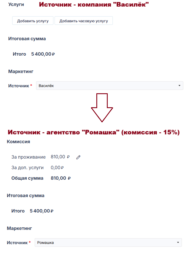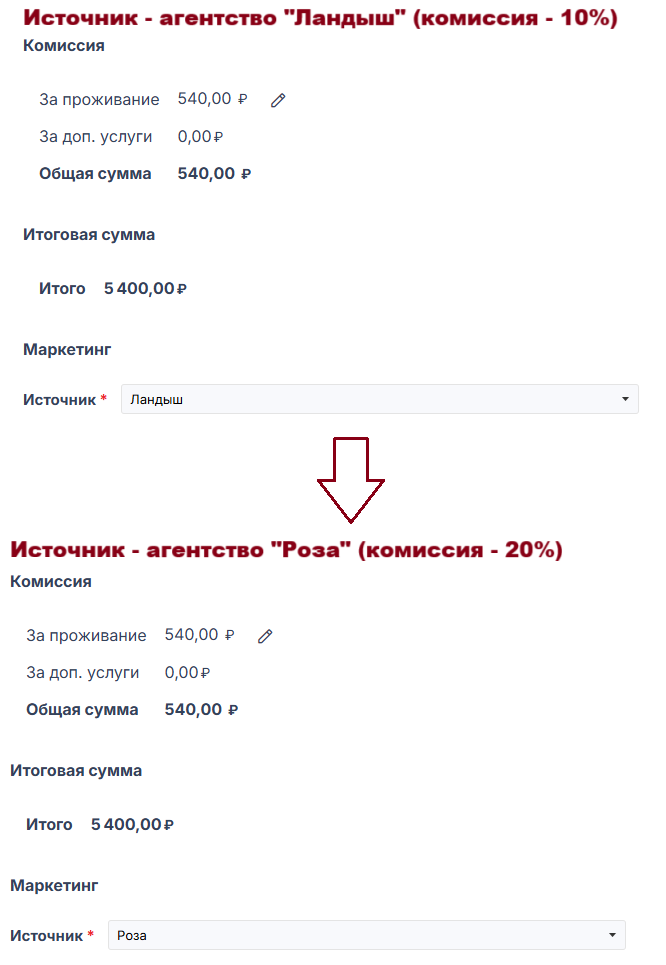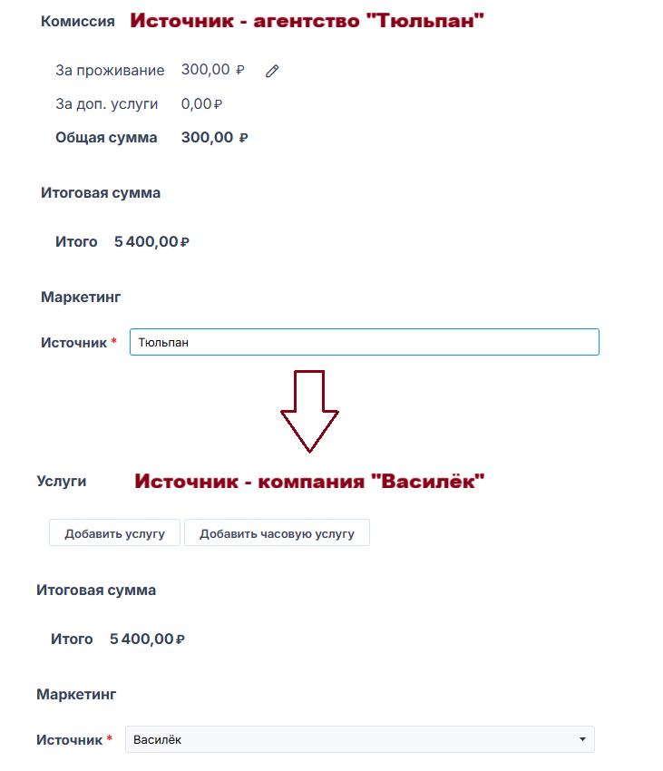Если вы меняете источник бронирования в карточке, блок «Комиссия» ведёт себя по-разному в зависимости от ситуации: