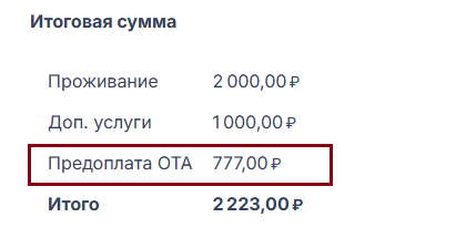 Если бронирование пришло от ОТА и у него есть предоплата в той же валюте, что и в отеле, в блоке «Итоговая сумма» появится поле «Предоплата ОТА».