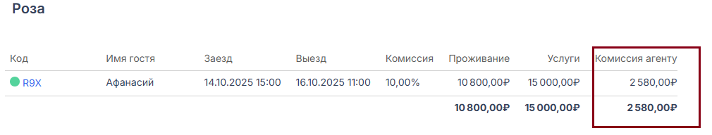 Все данные о комиссиях — за проживание и дополнительные услуги — автоматически попадают в «Отчёт комиссионера», в поле «Комиссия агенту».