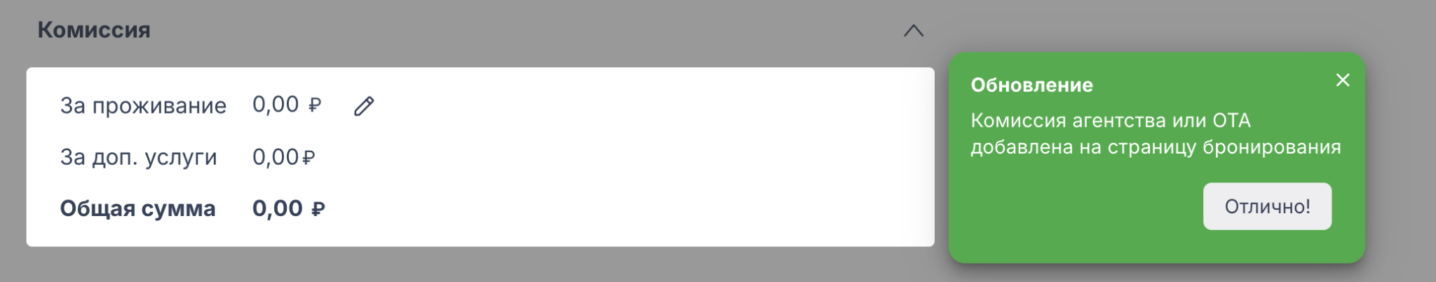 - Если бронь пришла от ОТА или Агентства, в карточке появится новый блок «Комиссия».