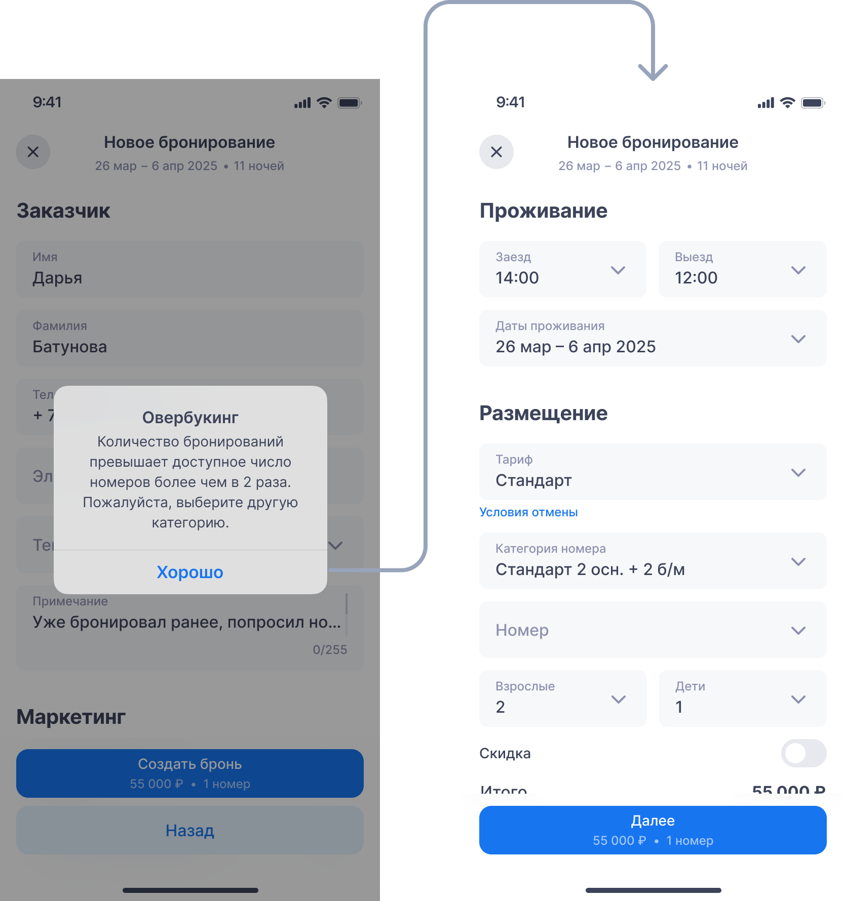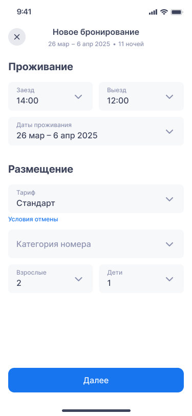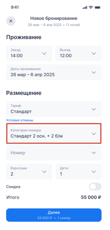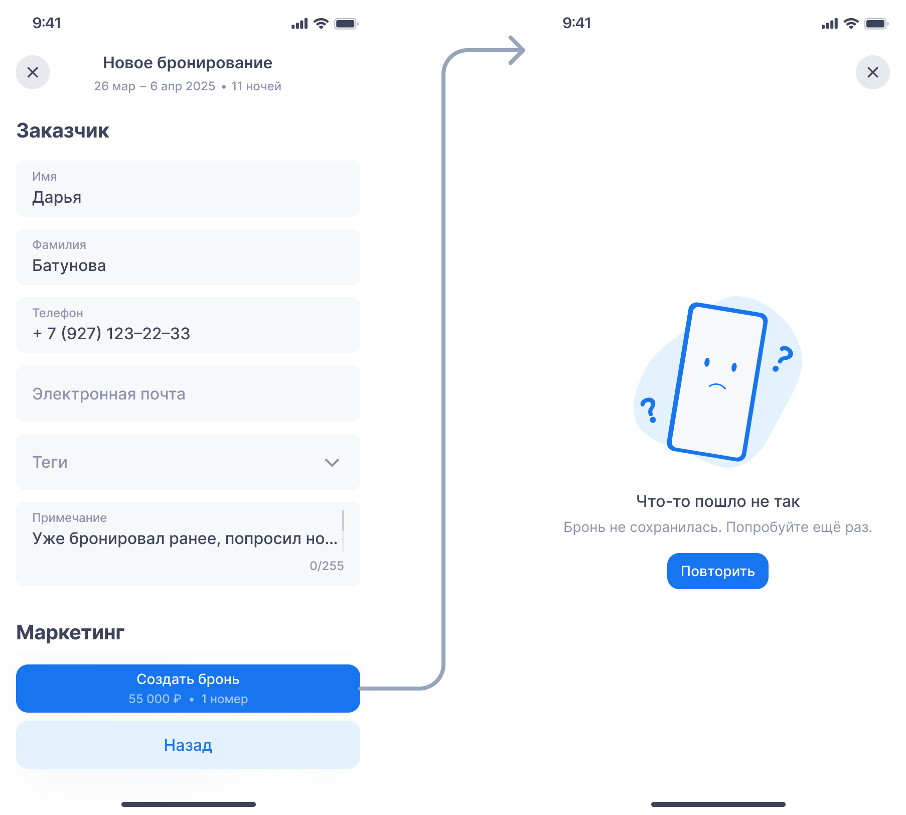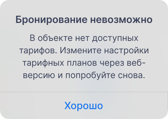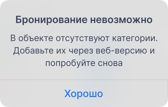 Примечание. Если при завершении бронирования произошла ошибка, бронь не сохранится, но вы сможете продолжить работу — приложение сохранит введённые данные в черновике.