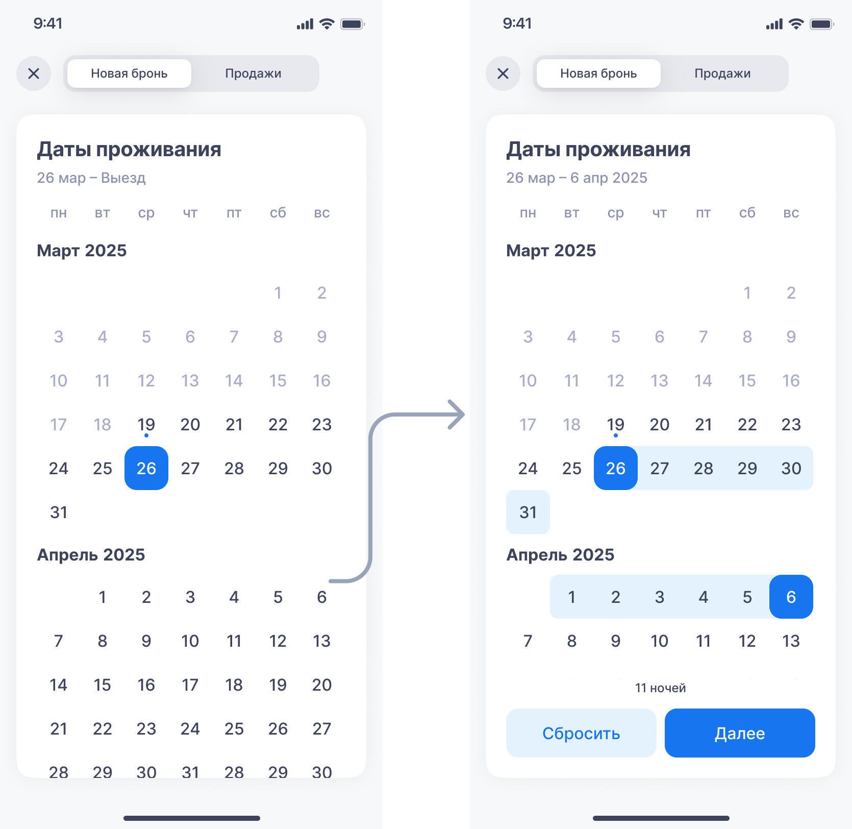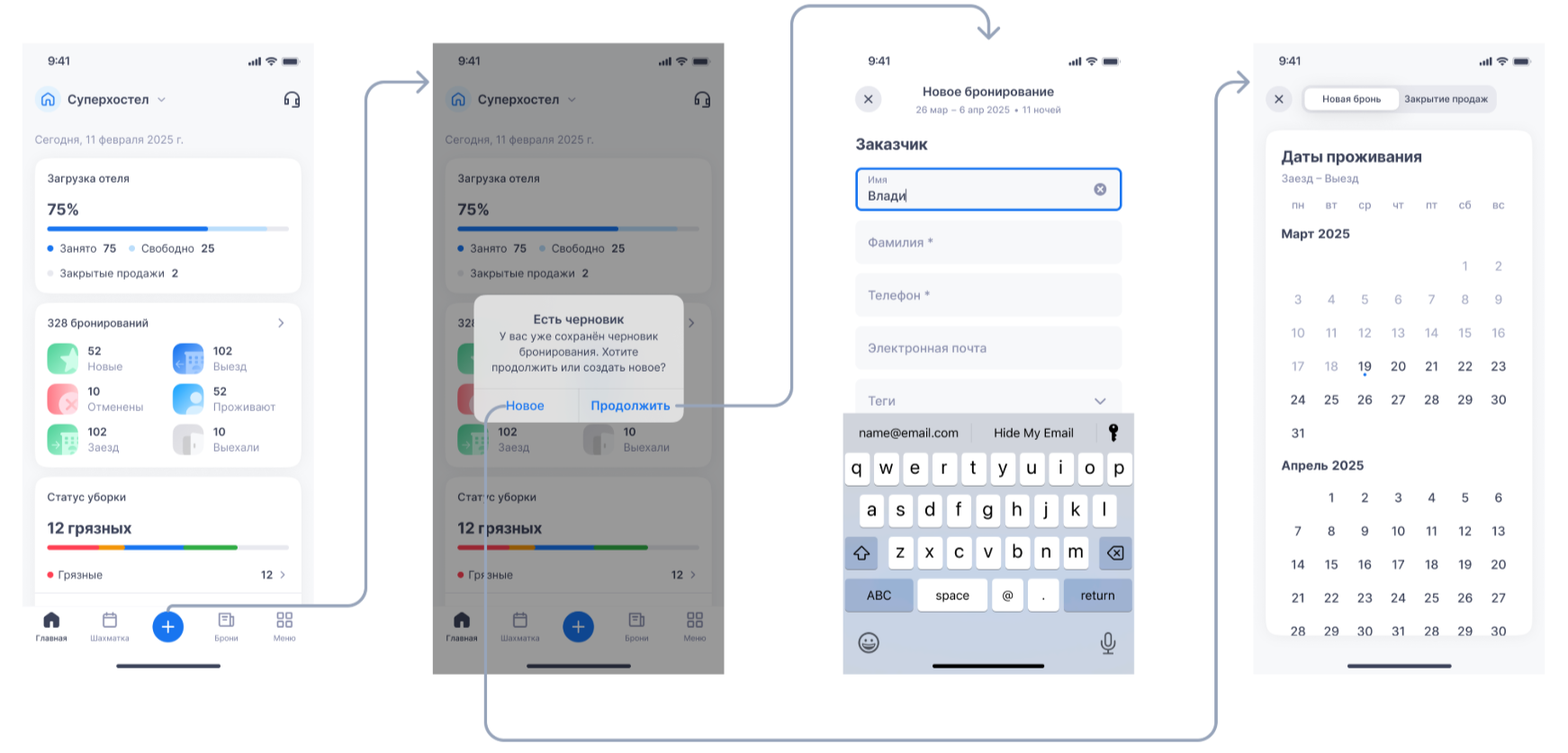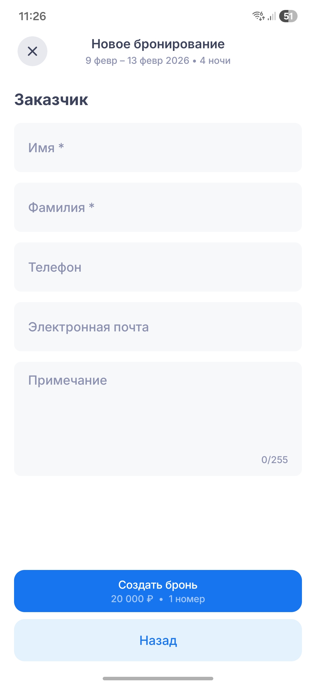 Примечание. Если при завершении бронирования произошла ошибка, бронь не сохранится, но вы сможете продолжить работу — приложение сохранит введённые данные в черновике.