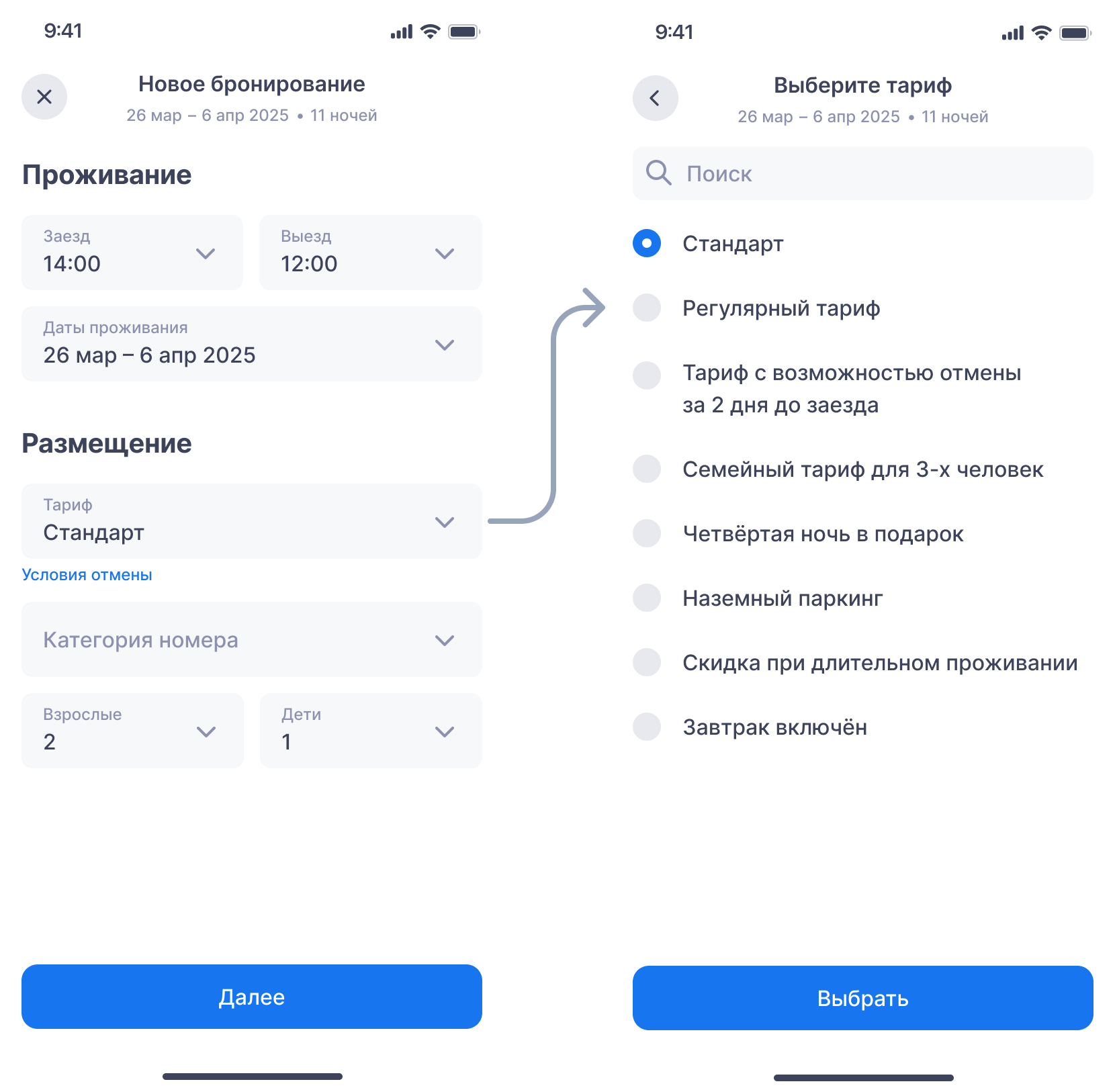 2. Тариф — выбранный при бронировании тариф. Вынесен в отдельный блок для удобства.