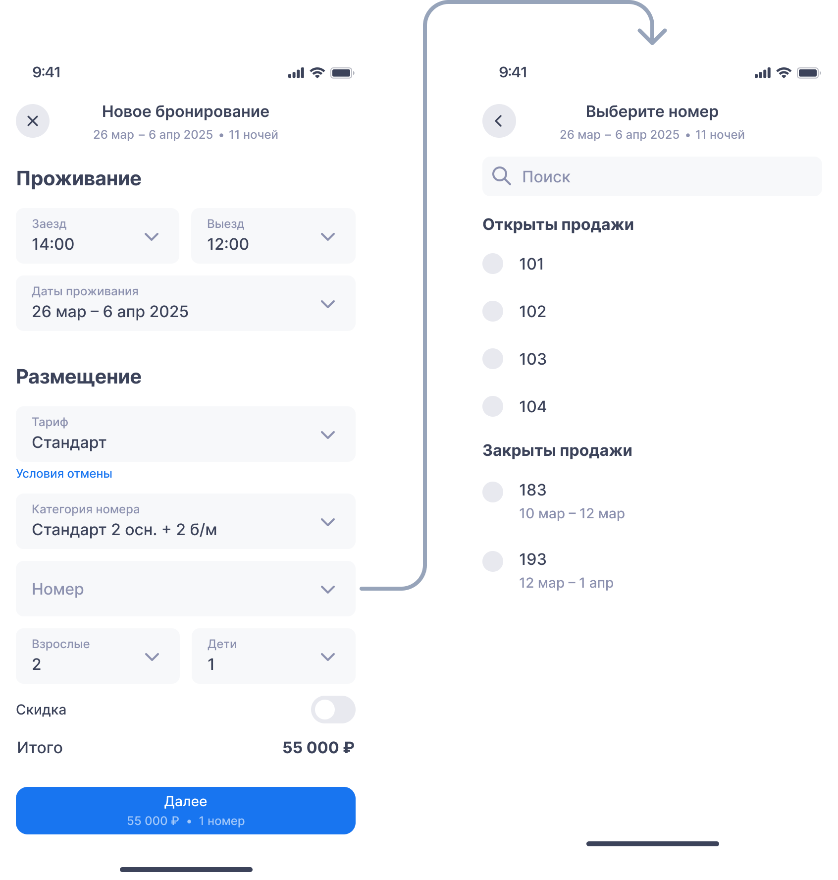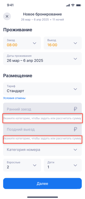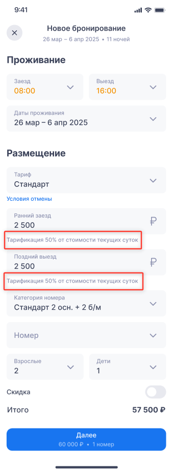 Даты и время заезда/выезда. Если есть ранний заезд или поздний выезд — время будет подсвечено