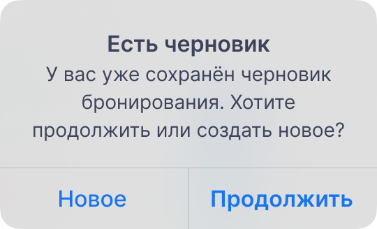 «Есть черновик. У вас уже сохранён черновик бронирования. Хотите продолжить или создать новое?»