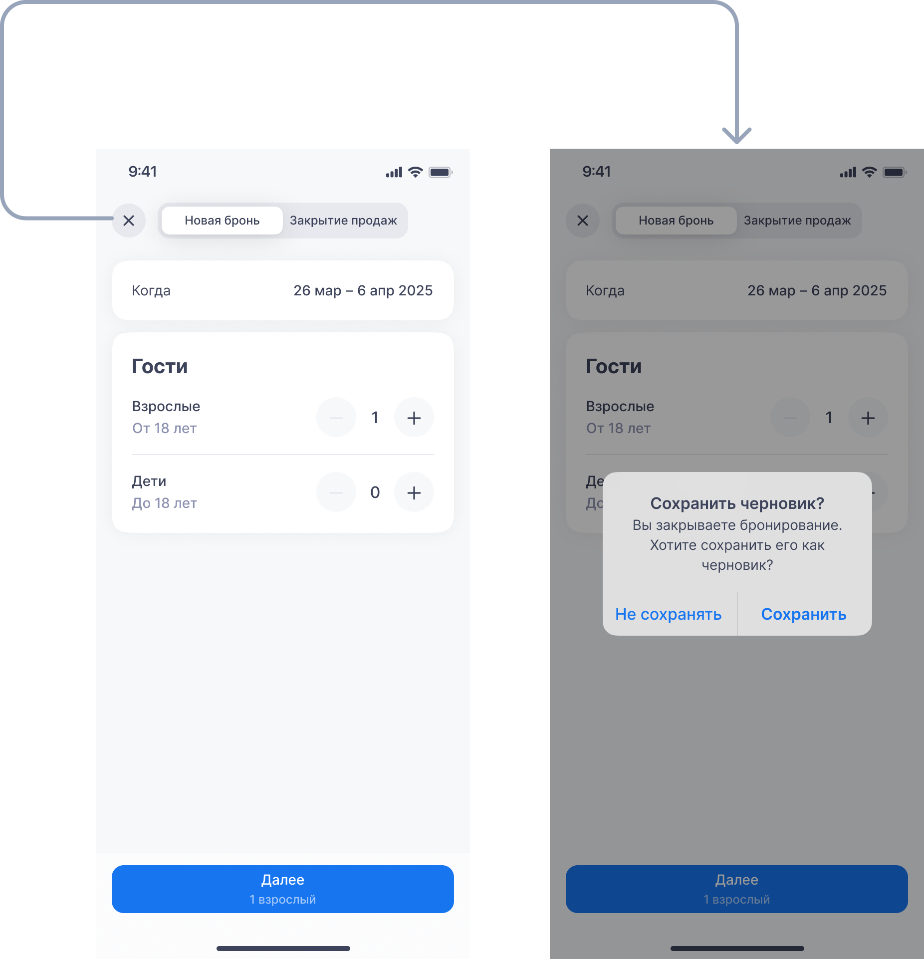«Сохранить черновик? Вы закрываете бронирование. Хотите сохранить его как черновик?»
