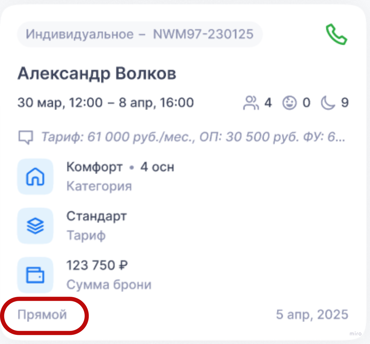 - Тариф — выбранный при бронировании тариф. Вынесен в отдельный блок для удобства.