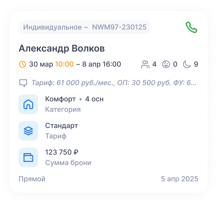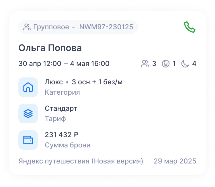 - Детали бронирования — включает источник брони, дату создания и маркетинговую информацию.