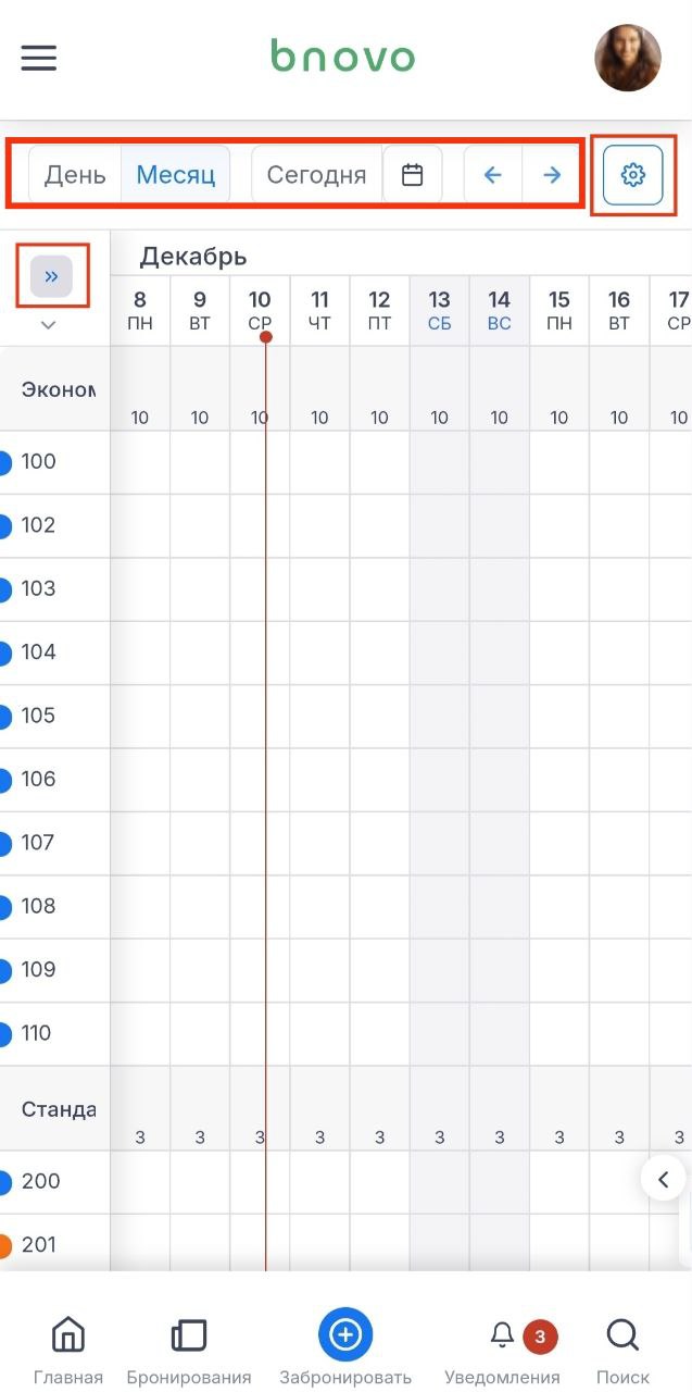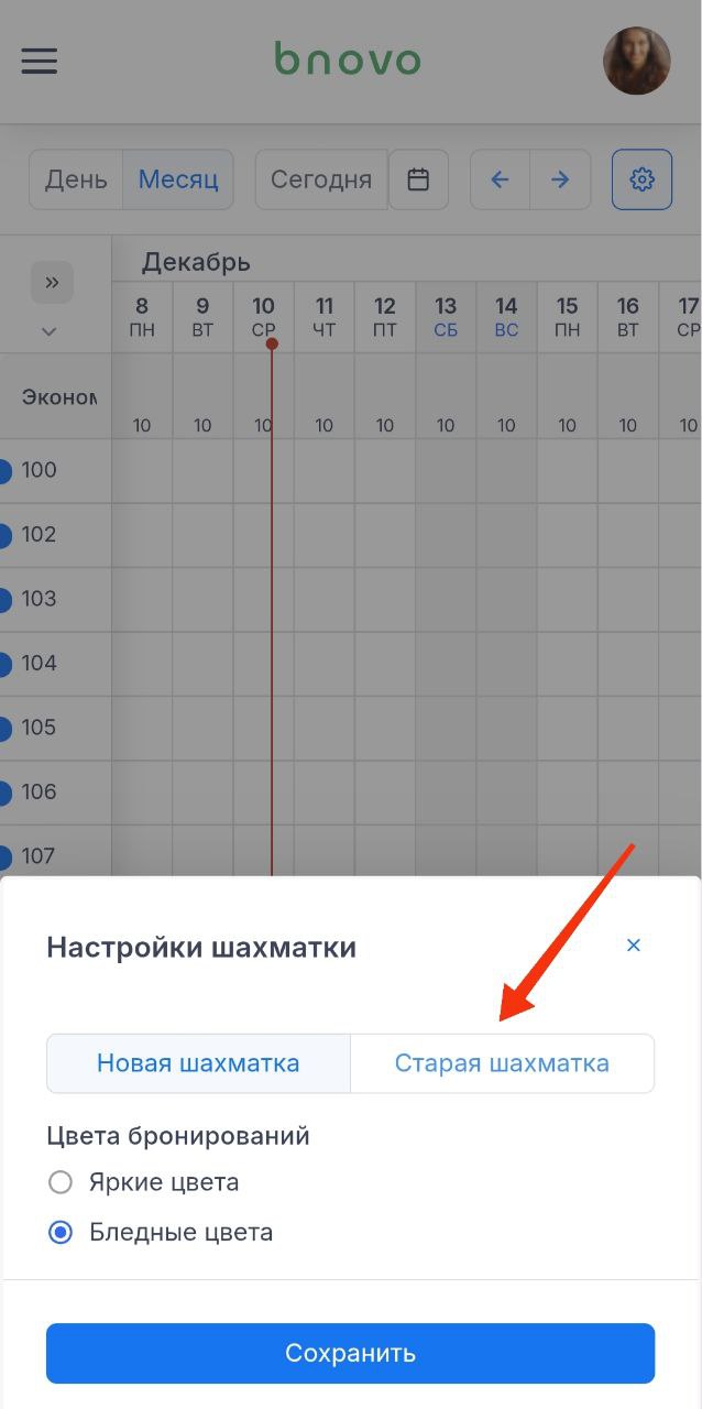 - Нажав на значок ⚙, можно выбрать цвета бронирований (пастельные и насыщенные) и переключиться на старую шахматку.