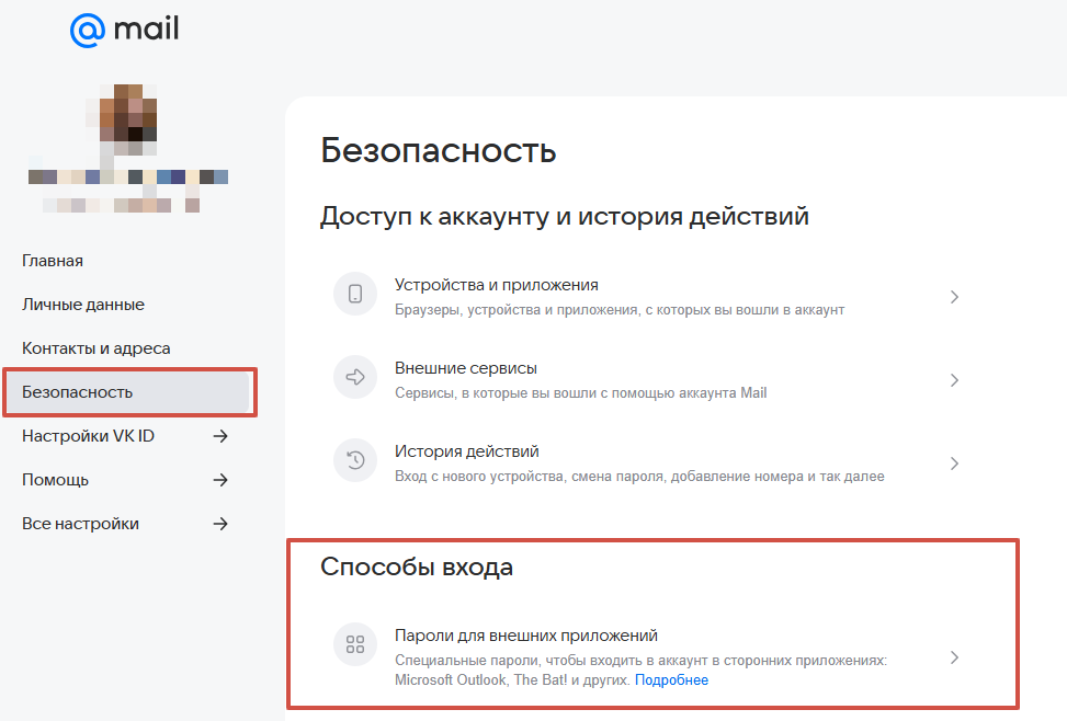 В новом окне найдите блок «Способы входа» → перейдите на Пароли для внешних приложений.