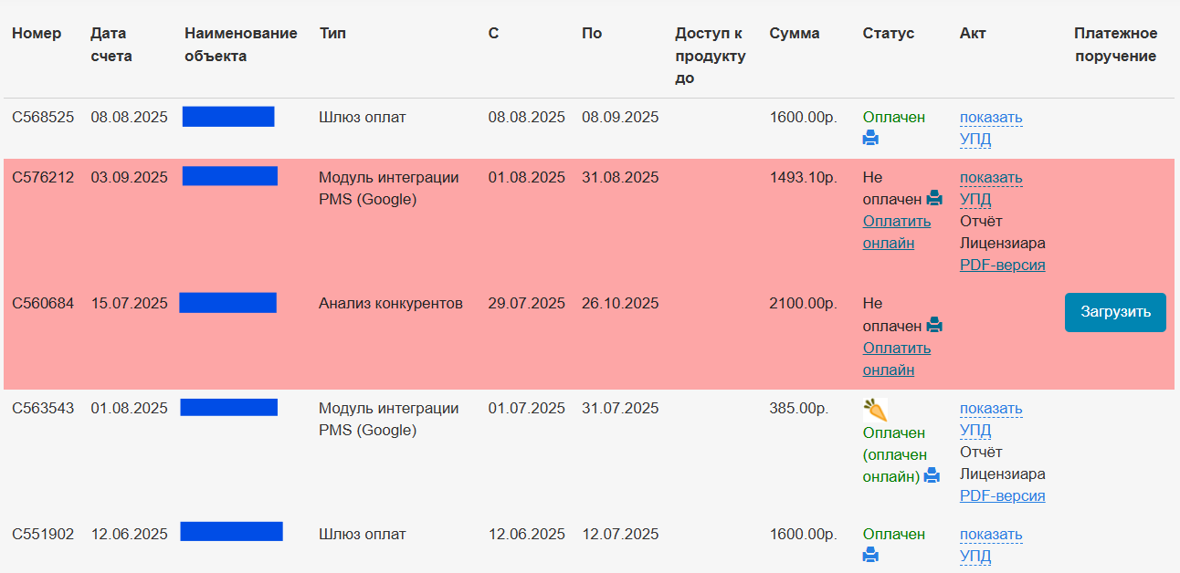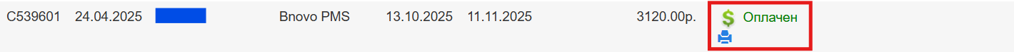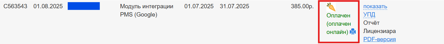 • Если значок есть в колонке «Статус», значит счёт был оплачен онлайн.