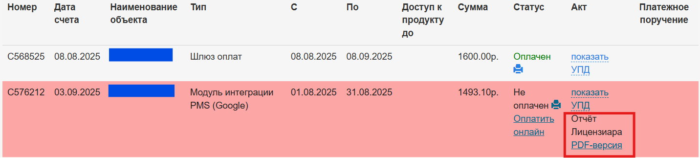 Отчёт лицензиара появляется в колонке «Акт». Нажав на PDF-версию, можно скачать файл с этим отчётом.