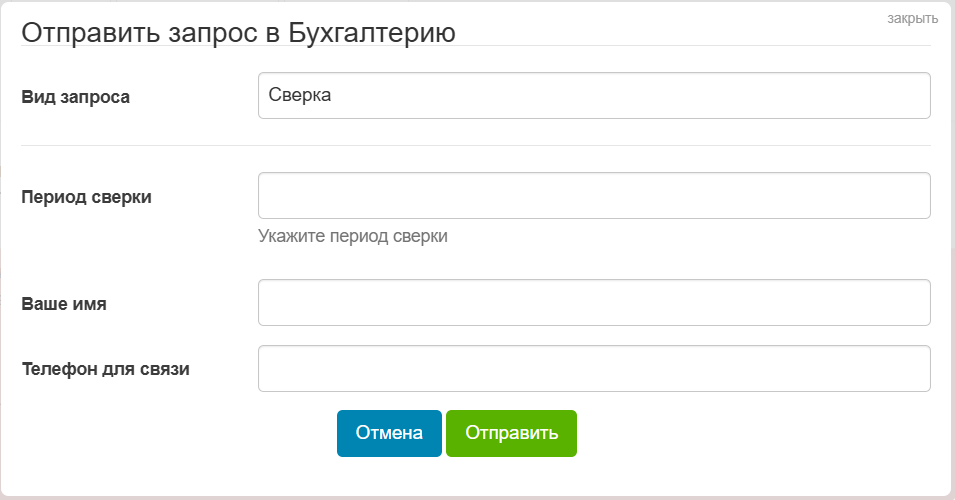 2. Отправить запрос в Финансовый отдел → Нажмите на кнопку «Отправить запрос в Бухгалтерию» и заполните форму.