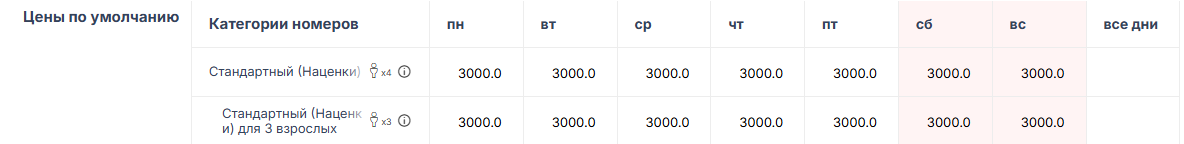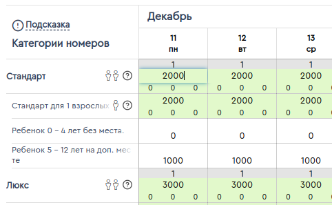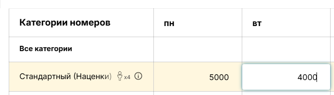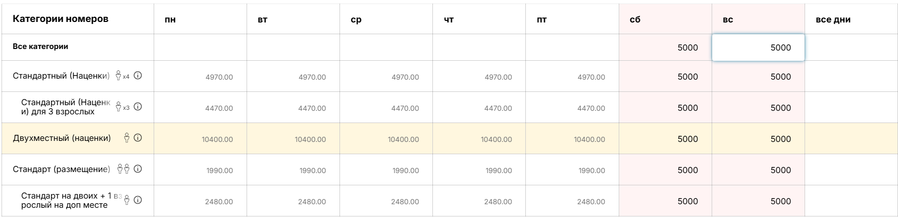 | Закрыт на продажу | Категория номера полностью недоступна для бронирования на даты, где стоит это ограничение.