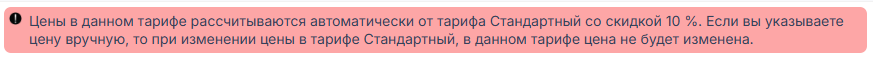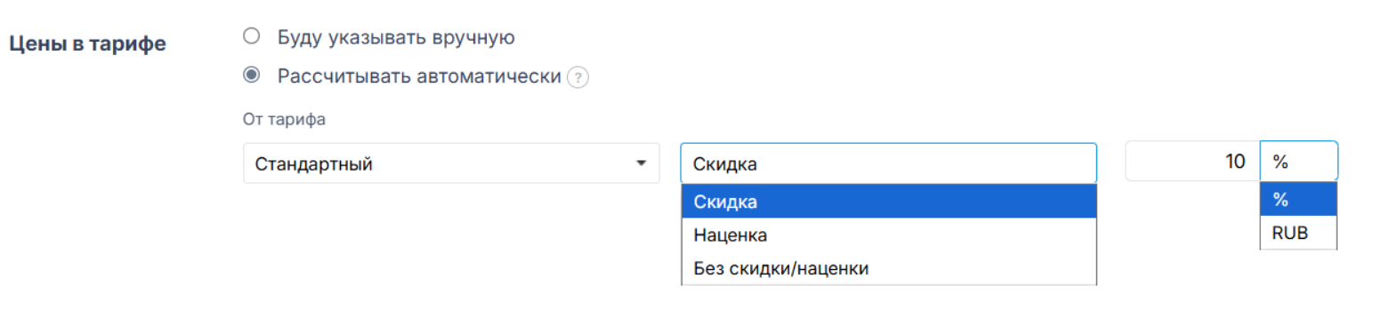 | Без скидки/наценки | Цены будут равны родительскому тарифу | Дополнительное поле не появится. |