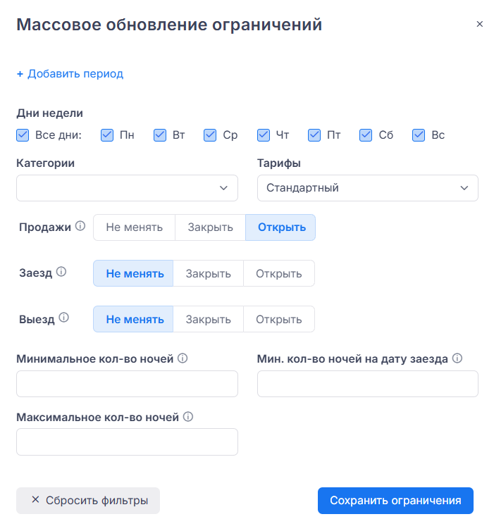 | Ограничения | Правила минимума/максимума дней, закрытых дат заезда или выезда, влияющие на возможность бронирования. |