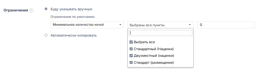 | Минимальное количество дней | Задаёт минимальное число ночей, на которое можно забронировать номер, если на период проживания попадает дата с этим ограничением, если хотя бы одна ночь проживания попадает на такую дату.
