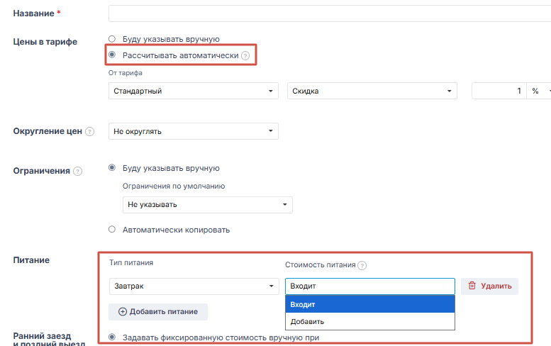 - Укажите «Добавить питание» → выберите тип питания из выпадающего списка → укажите способ расчета питания (если поле появляется)