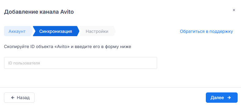 - На следующем шаге введите в форму ID профиля Аvito и нажмите «Далее»: