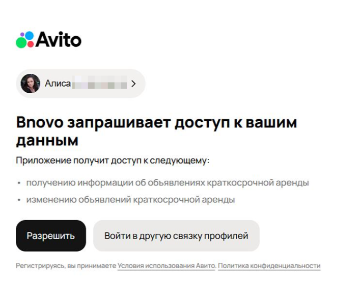 - Разрешите доступ к вашим данным, затем вы автоматически вернетесь к подключению в Bnovo PMS.