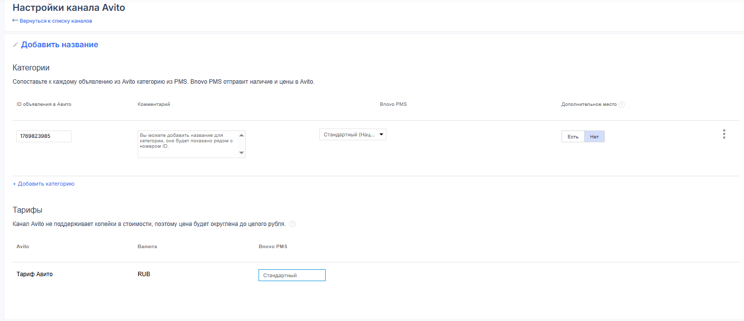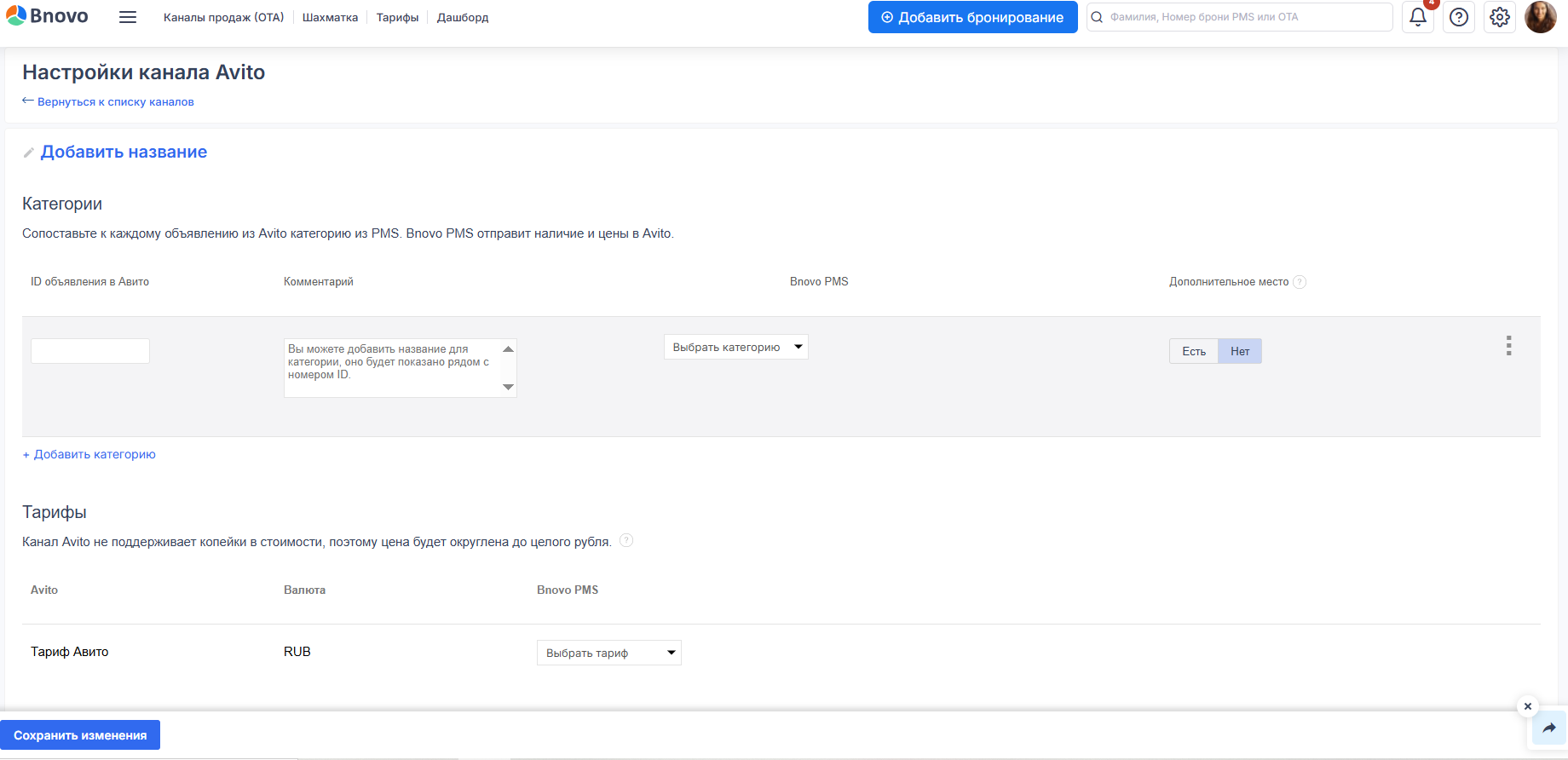 - В колонке «Bnovo PMS» выберите категорию номера из Bnovo — стоимость этой категории будет передаваться в Avito как цена за минимальное размещение.
