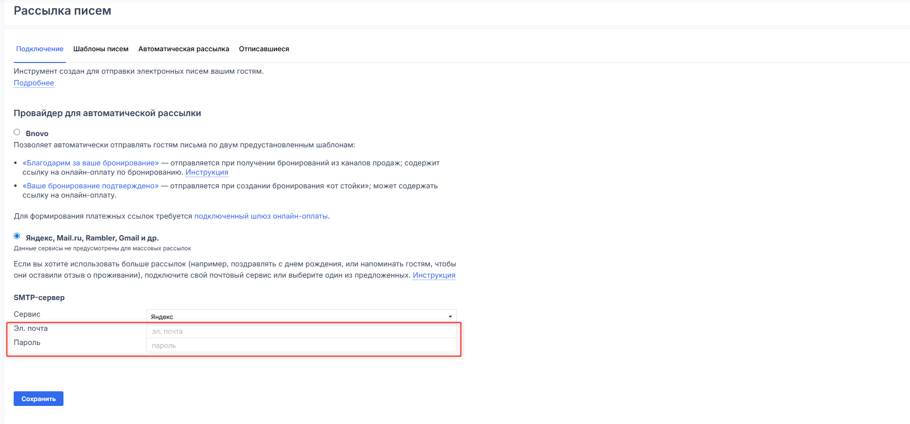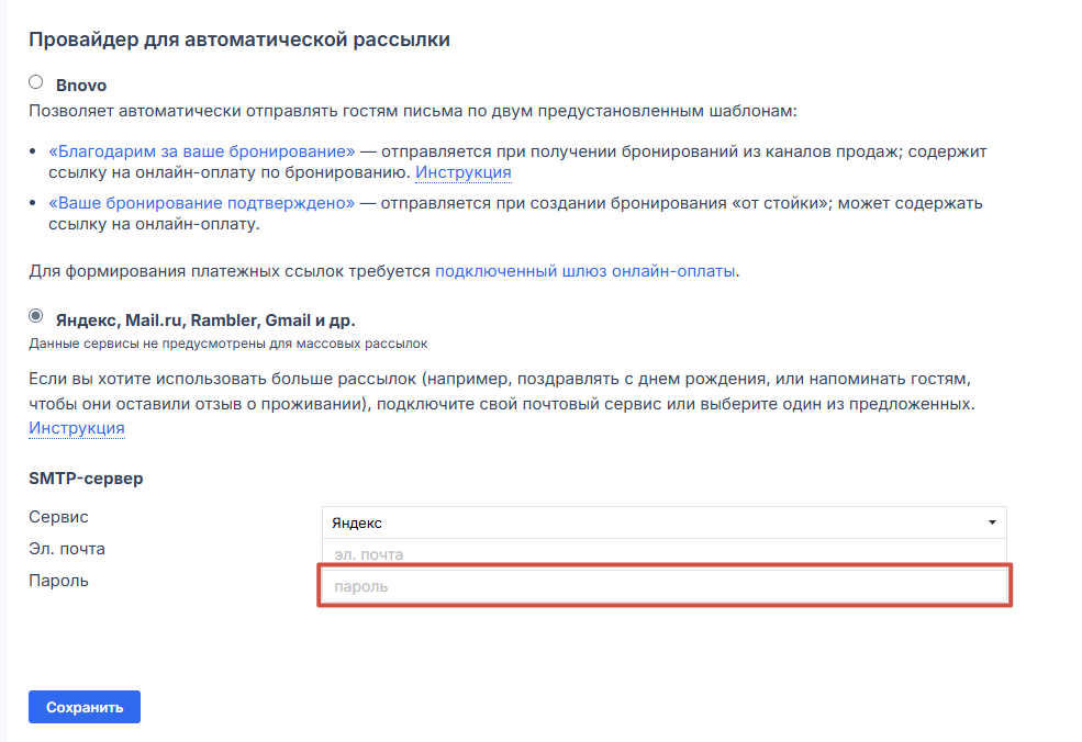 3. После проверки настроек в rambler перейдите в личный кабинет Bnovo и продолжите настройки: